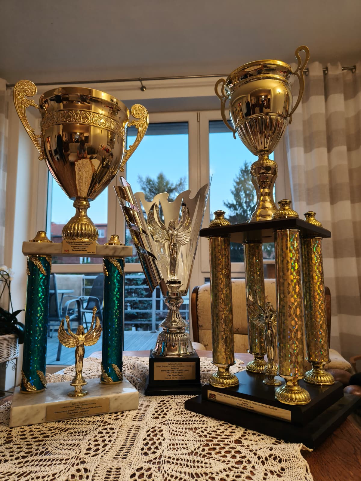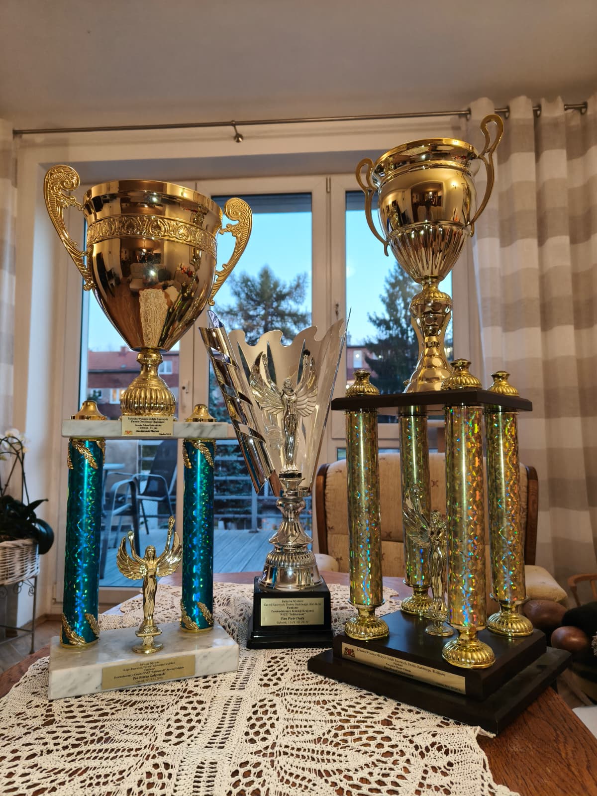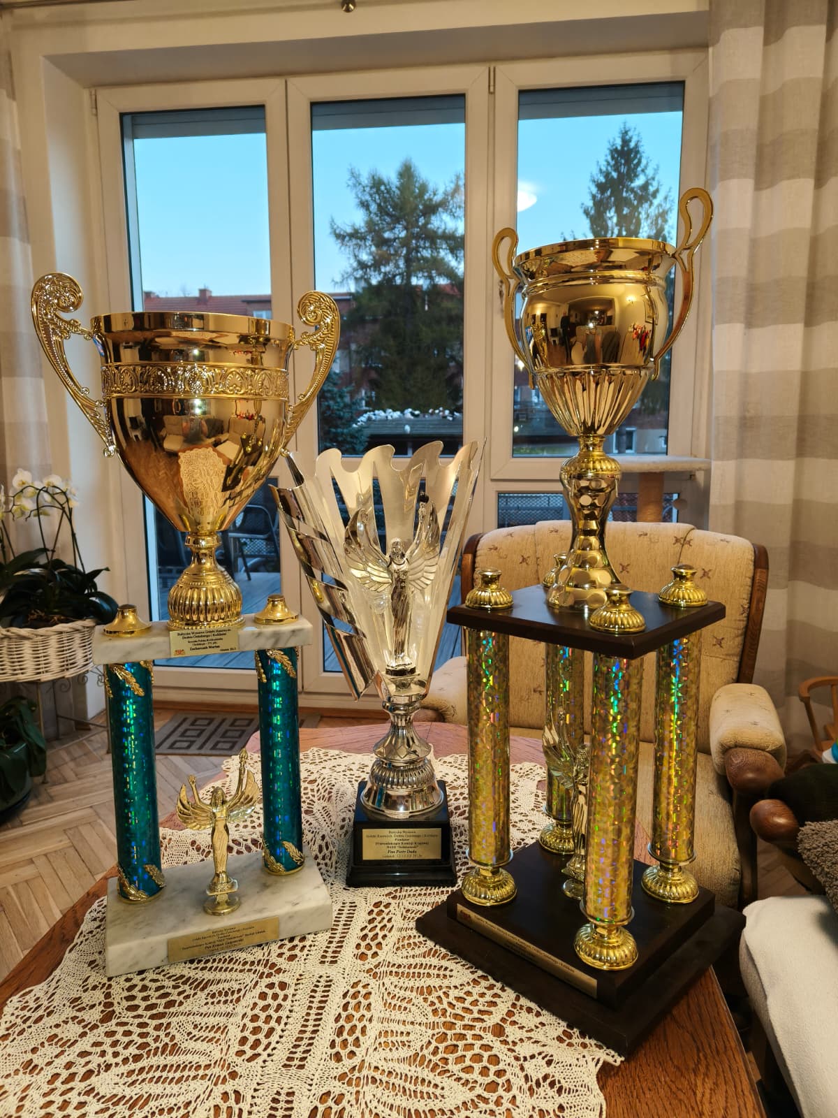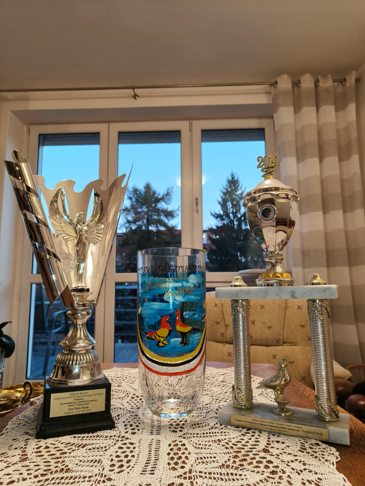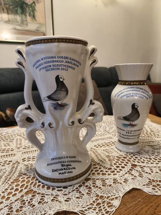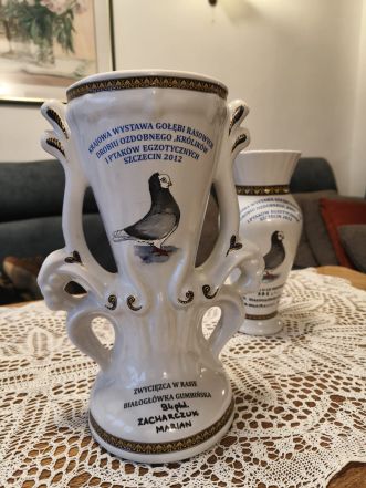 ON: Liczne puchary i medale na wystawach gołębi rasowych.